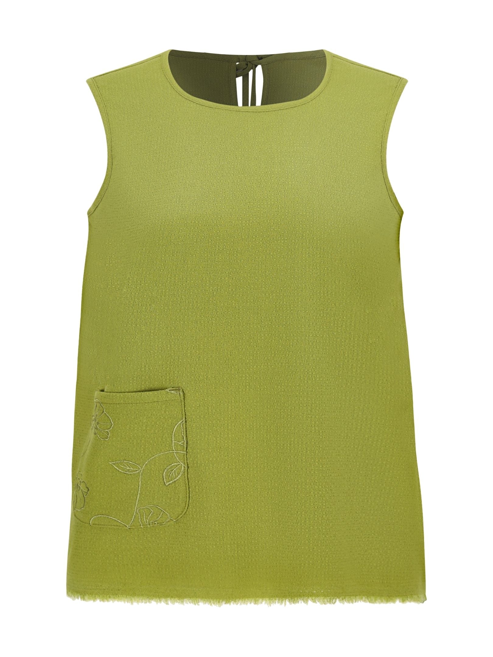 Features a floral embroidery patch pocket at the front and an adjustable tie closure at the back neckline. The hem retains the fabric’s original selvage edge, offering an unrefined finish.